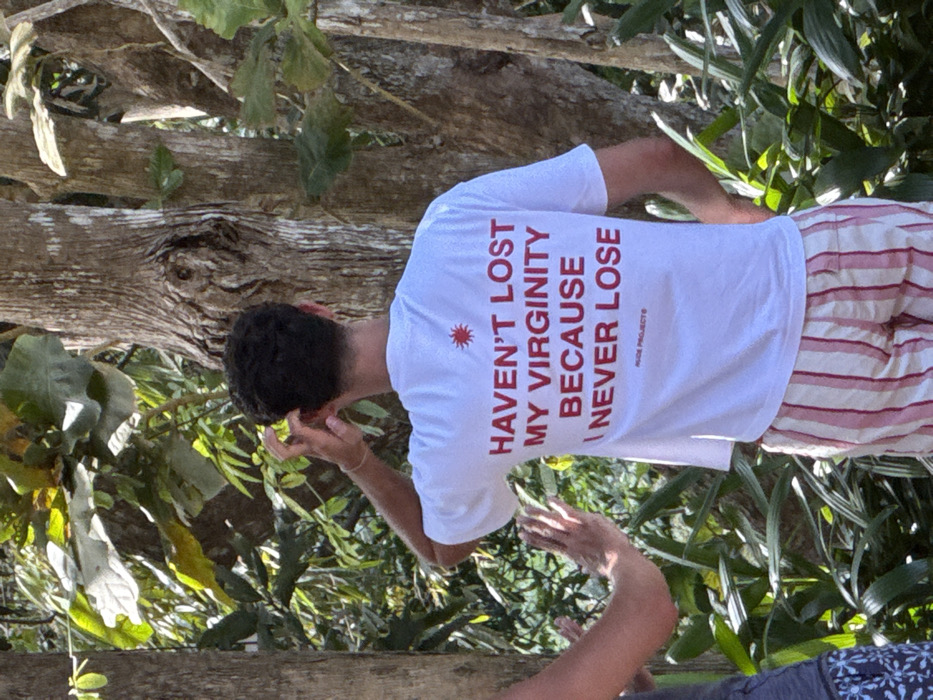 A daylight outdoor scene in Ungasan, Indonesia, features two individuals amidst dense tropical foliage. The primary subject is a male, viewed from the back, standing upright. He wears a white short-sleeved t-shirt with red text on the reverse reading "HAVEN'T LOST MY VIRGINITY BECAUSE I NEVER LOSE," with "RUDE PROJECT®" beneath. He is also wearing light-colored shorts with prominent reddish-pink vertical stripes. His right hand is raised to the back of his head, with fingers near his right ear. To the immediate left, a second individual's left arm and part of their torso are visible. This individual's left hand is raised, open with the palm slightly forward. They are wearing dark, possibly patterned, shorts. The environment is characterized by large, textured tree trunks and abundant green leafy vegetation, consistent with a tropical or forested setting. The scene is brightly illuminated by natural light.