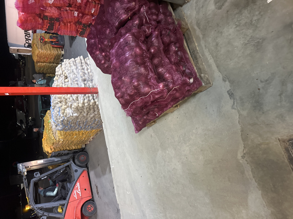 This image depicts a nighttime scene at a produce handling facility in Plodovitovo, Bulgaria. The environment features a concrete floor with some minor staining and debris. In the foreground, on the right side, two wooden pallets are stacked with multiple mesh bags of red/purple onions. Each bag is full, containing numerous onions. In the midground, to the left, a red and grey Linde forklift is positioned on the concrete surface. A person, dressed in a light blue-green jacket and dark trousers, is seated in the operator's compartment, appearing to operate the vehicle's controls. The forklift is situated near large stacks of produce. Adjacent to and behind the forklift, numerous pallets are stacked high with produce contained in mesh bags. There are large quantities of yellow-bagged produce and white-bagged produce, consistent with potatoes. A vertical red metal support column is visible in the center-right midground, separating some of the produce stacks. Further in the midground and background, several individuals are present. One person, wearing a dark garment, is partially visible behind yellow-bagged produce. Another individual, also in a light blue-green jacket and dark trousers, stands near a white semi-trailer truck. A third person is partially obscured in the background. The background reveals a large white semi-trailer truck with "SPRINT" branding on its side. A red pallet jack is visible near the truck's rear. Other vehicles, including what appears to be a green car and additional trucks, are dimly visible in the dark, indicating an active loading or storage area. Further stacks of red-bagged produce are visible in the background near the white truck. The entire scene is illuminated by artificial lighting.
