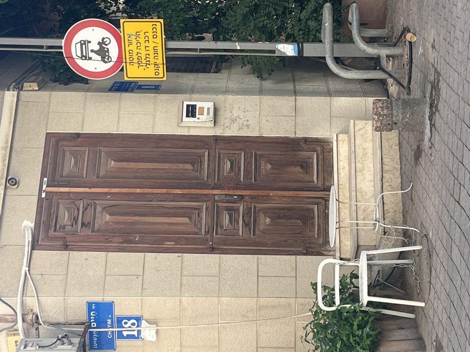 The image depicts a static urban street scene outside 18 Chayim Street in Tel Aviv, Israel. A prominent, double-panel wooden door with a dark, weathered finish is centrally positioned, recessed behind three light-colored stone steps. Above the door, a security camera is mounted on the beige-tiled building facade. To the left of the steps, a white metal café chair and a small, round white metal table are situated on the cobblestone pavement. Both the chair and table are secured by a metal chain. A planter containing green foliage and small blue flowers is visible to the left of the chair. A circular metal manhole cover is partially visible beneath the chair. On the building wall to the left of the door, a blue street sign marked "CHAYIM st." and a blue address number "18" are affixed. To the right of the door, a small, weathered white intercom or electrical box is mounted on the wall. Further to the right, a grey metal utility pole stands on the pavement. Attached to this pole are two signs: a circular red-and-white traffic sign prohibiting cars and motorcycles, and a rectangular yellow sign with black Hebrew text further detailing vehicle restrictions (no two-wheeled vehicles entering/parking). Below the signs, a grey metal bicycle rack is present. A cylindrical concrete bollard with a rusted top is positioned on the pavement between the table and the utility pole. A single light-colored disposable cup lies on the ground near the bicycle rack. Green shrubbery is visible behind the utility pole and rack. No individuals, actions, or interactions are depicted in the scene.