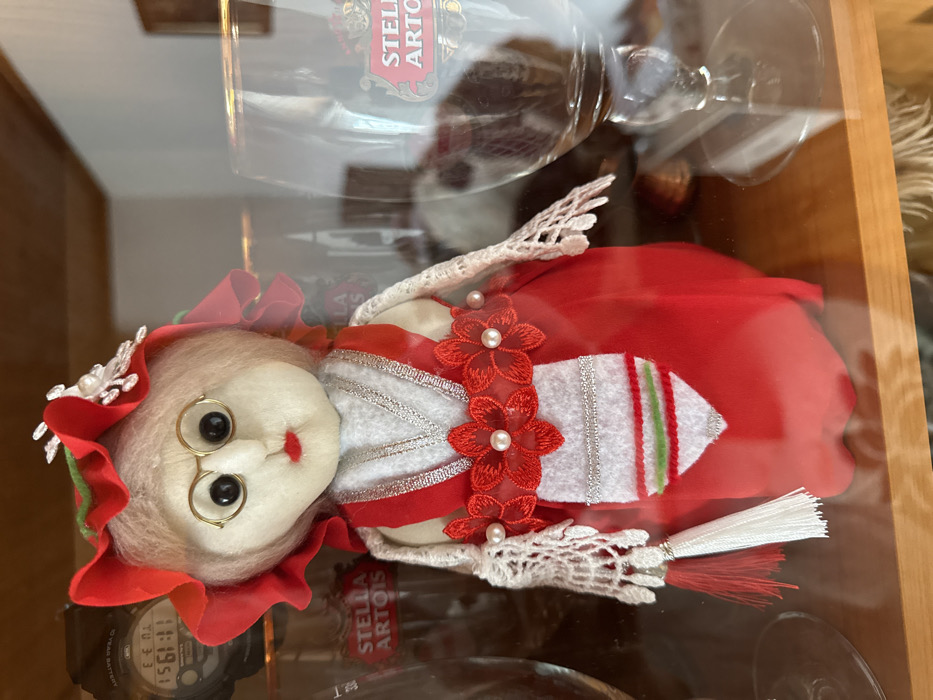 A fabric doll, dressed in a red traditional-style costume, stands prominently within a glass display cabinet in Shabla, Bulgaria