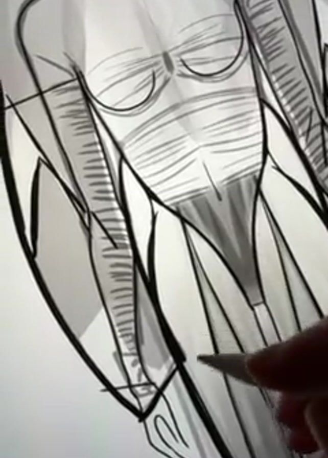 A person is sketching a design on a tablet with a stylus. The design is a female figure wearing a dress. The figure is stylized, with an elongated torso and exaggerated features. The dress has a fitted bodice and a flowing skirt. The sketch is in black and gray, with shading to indicate the contours of the figure and the fabric. The person's hand is visible as they draw, and a few notes are written on the tablet next to the drawing. The background is white.