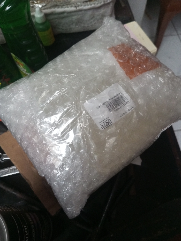 The image depicts a package, roughly rectangular in shape, positioned diagonally on a dark surface in an indoor setting located in Ciherang, Indonesia