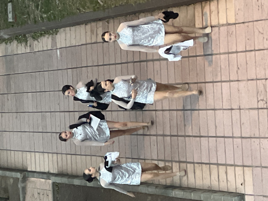 Five young women are depicted walking in a group from left to right across a paved pedestrian pathway in Playa Del Inglés, Spain. All five individuals wear identical silver-sequined short dresses with sheer long sleeves and halter-necklines, along with what appear to be stage makeup, including red lipstick, and their hair pulled back in buns. Several individuals wear beige, flat-soled performance shoes. From left to right: 1. A woman carrying a folded white garment and a black item in her left hand. 2. A woman holding white papers or documents and a black shoulder bag in her left hand. 3. A woman carrying a black backpack on her shoulders and holding a small electronic device in her left hand. 4. A woman carrying a black shoulder bag in her left hand and a dark-colored bottle in her right hand. 5. A woman carrying a folded white garment and a pair of black shoes in her left hand. The pathway consists of reddish-brown rectangular paving slabs arranged in a grid pattern. To the left, a concrete curb or low wall borders the path. To the right, a strip of sparse vegetation or grass is visible, also bordered by a concrete edge. The scene is illuminated by ambient light, possibly indicating dusk or an overcast condition. The perspective is an overhead, slightly downward-angled view.