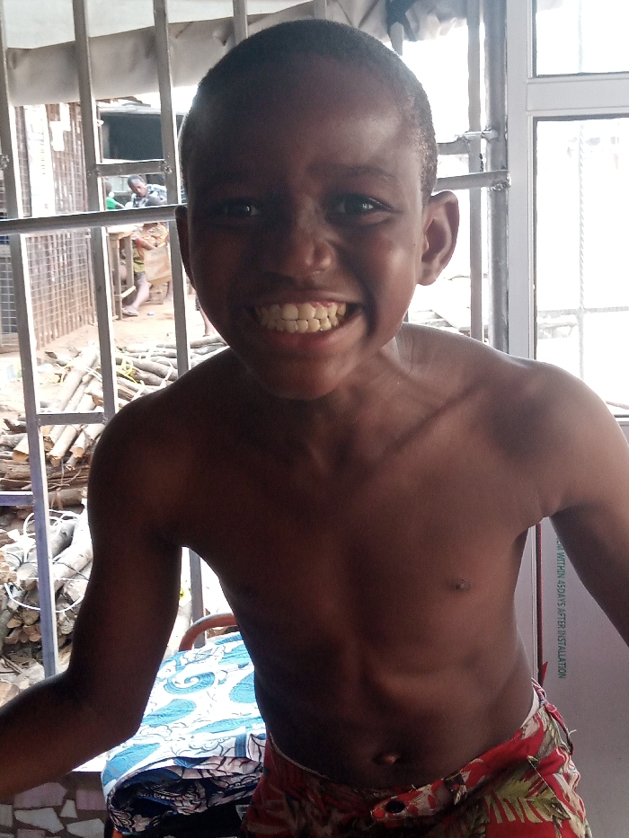 An image taken in Obosi, Nigeria, depicts a male child, estimated to be pre-adolescent, with dark skin and short, dark hair, positioned centrally in the foreground