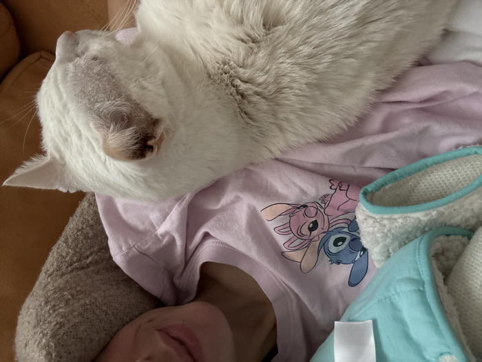 A close-up, indoor scene in Dos Hermanas, Spain, depicts a person and a white cat. The upper portion of a person's face, including the mouth and chin, is visible on the upper right, partially obscured by a textured, light brown cushion or headrest. The person is wearing a light pink short-sleeved t-shirt featuring a graphic of the blue character Stitch and the pink character Angel. A turquoise-colored blanket, quilted or padded, with a visible white sherpa-like lining and a white label, is partially draped over the person's left side. A white, short-haired cat is resting or sleeping on the person's lap or lower torso, occupying the majority of the lower frame. The cat's head is in profile, facing right, with the tip of its right ear appearing slightly discolored. An orange-brown surface, likely part of a sofa or armchair, is visible to the right of the cat. Both subjects appear to be at rest.
