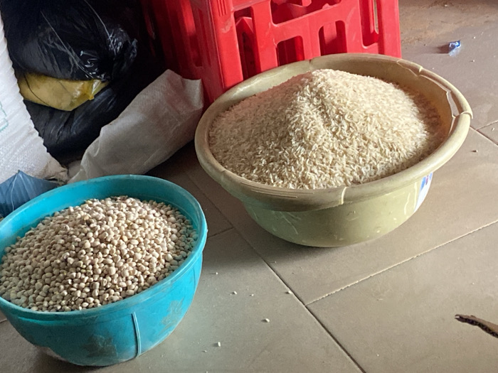 The image displays an indoor scene in Jos, Nigeria, featuring bulk foodstuffs