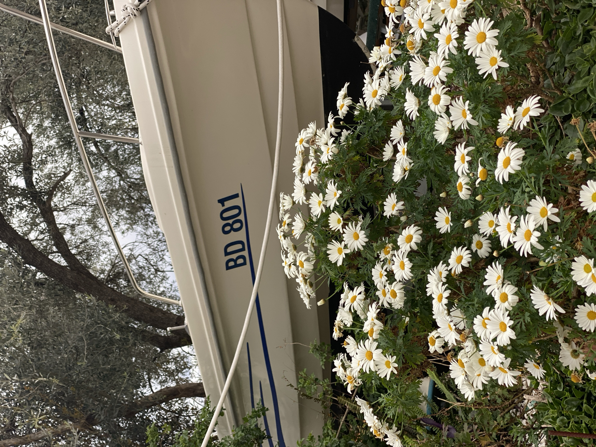A boat, marked "BD 801" on its side, stands beside a bush of white daisies