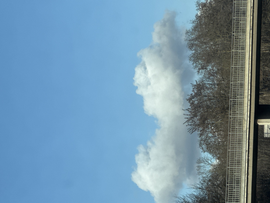 This image presents an outdoor scene located in Souffelweyersheim, France. The upper two-thirds of the frame are dominated by a clear, bright blue sky. A horizontal formation of white and light grey cumulus clouds is positioned across the mid-section, extending from left to right. Below these clouds, a dense line of leafless deciduous trees, characteristic of late autumn or winter, stretches across the horizon. A concrete overpass or bridge, equipped with a light grey metal barrier railing, runs horizontally across the lower middle portion of the image. A segment of a concrete support pillar for the bridge is visible on the right side, descending from the bridge deck. No individuals, vehicles, or specific actions are depicted within the frame.
