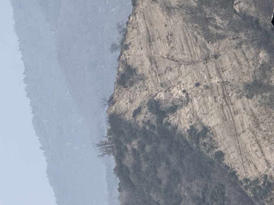 This image depicts a mountainous landscape in the vicinity of Kresna, Bulgaria, under hazy atmospheric conditions. The central feature is a steep, light brown or tan-colored hillside characterized by distinct horizontal geological striations, indicative of layered rock formations. Patches of dark, sparse vegetation, including several bare deciduous trees and shrubs, are scattered across this slope and along its ridgeline. A prominent cluster of bare trees stands on the highest visible point of the main ridge. In the mid-ground, a thin, dark line, consistent with an overhead utility wire, traverses horizontally across the lower portion of the central slope. The background consists of multiple layers of larger, blue-grey mountains, progressively fading into the haze. No individuals, animals, or significant man-made structures are visible, with the exception of the aforementioned wire. The overall lighting is diffuse, suggesting an overcast day or widespread atmospheric haze.