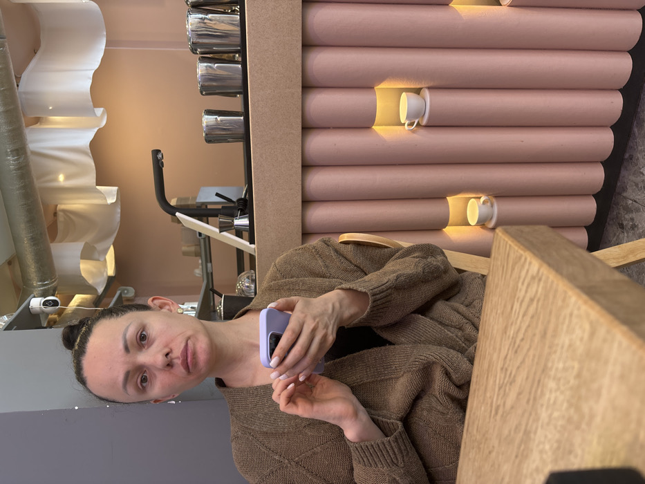 A female subject is depicted seated indoors at a light-colored wooden table within a cafe in Zelenogradsk, Russia. She possesses dark hair styled into a bun and wears a brown, cable-knit cardigan over a dark top. A gold stud earring is present in her right ear, while a silver-colored dangle earring hangs from her left ear. She holds a light purple-cased smartphone with both hands, thumbs positioned over the screen, indicating interaction. Her gaze is directed straight at the camera with a neutral expression. Behind the subject, a cafe counter features a modern black faucet, multiple silver-colored metal cups or pitchers, a metal jigger, and a dark paper cup. The lower portion of the counter is faced with vertically aligned, cylindrical pink-hued panels. Integrated into this paneling are two recessed, internally illuminated niches, each displaying a small white teacup on a matching saucer. The background wall above the counter is light pink. An exposed silver-colored ventilation duct runs horizontally across the upper background. A white security camera is affixed to the duct, and white draped fabric elements are suspended nearby.