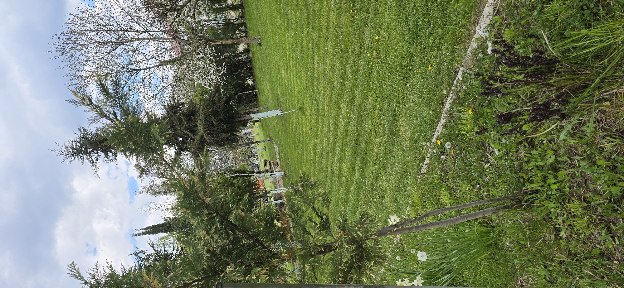 The image depicts a park scene in Yagoda, Bulgaria. The camera angle is ground-level, with a grassy lawn occupying the majority of the frame. The lawn is neatly mowed with distinct stripes. Several trees are present, varying in species and size. A conifer tree is prominent in the foreground, its branches extending into the view. Beyond the conifer, other trees of varying heights and types dot the landscape. Some appear to be deciduous, with bare branches or flowering blossoms. In the background, several white posts are visible, perhaps delineating a path or section of the park. A bench can also be seen further back, suggesting a place for people to rest. The sky is partially visible, with clouds indicating fair weather. The overall environment suggests a tranquil and well-maintained green space within Yagoda. At the edge of the lawn is a border of grass and weeds and some white flowers.