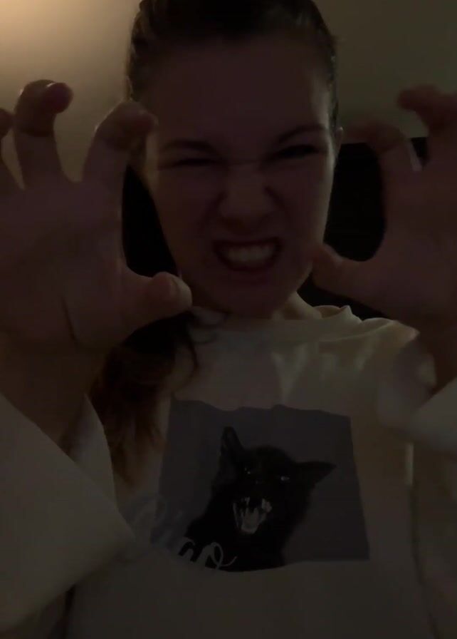 A woman with light skin and brown hair tied back in a ponytail is centered in the frame, making a clawing gesture with her hands and a fierce facial expression. She is wearing a light-colored sweatshirt with a graphic print of a black cat and the word "Ciao" below it. The lighting is dim, and the background appears to be a room with a door or window visible behind her. Her focus is directly at the camera.