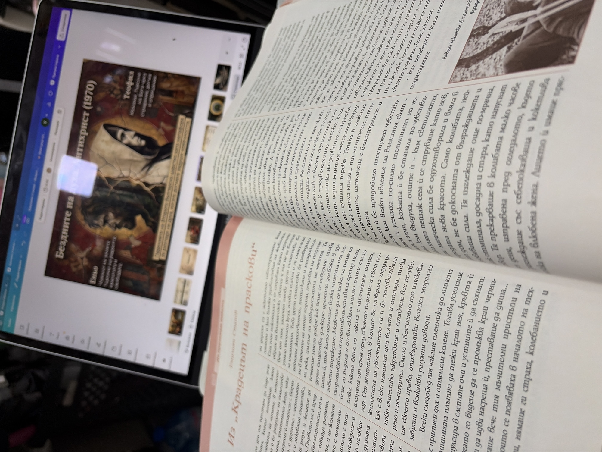 A photograph shows an open book next to a laptop, both displaying content in Bulgarian