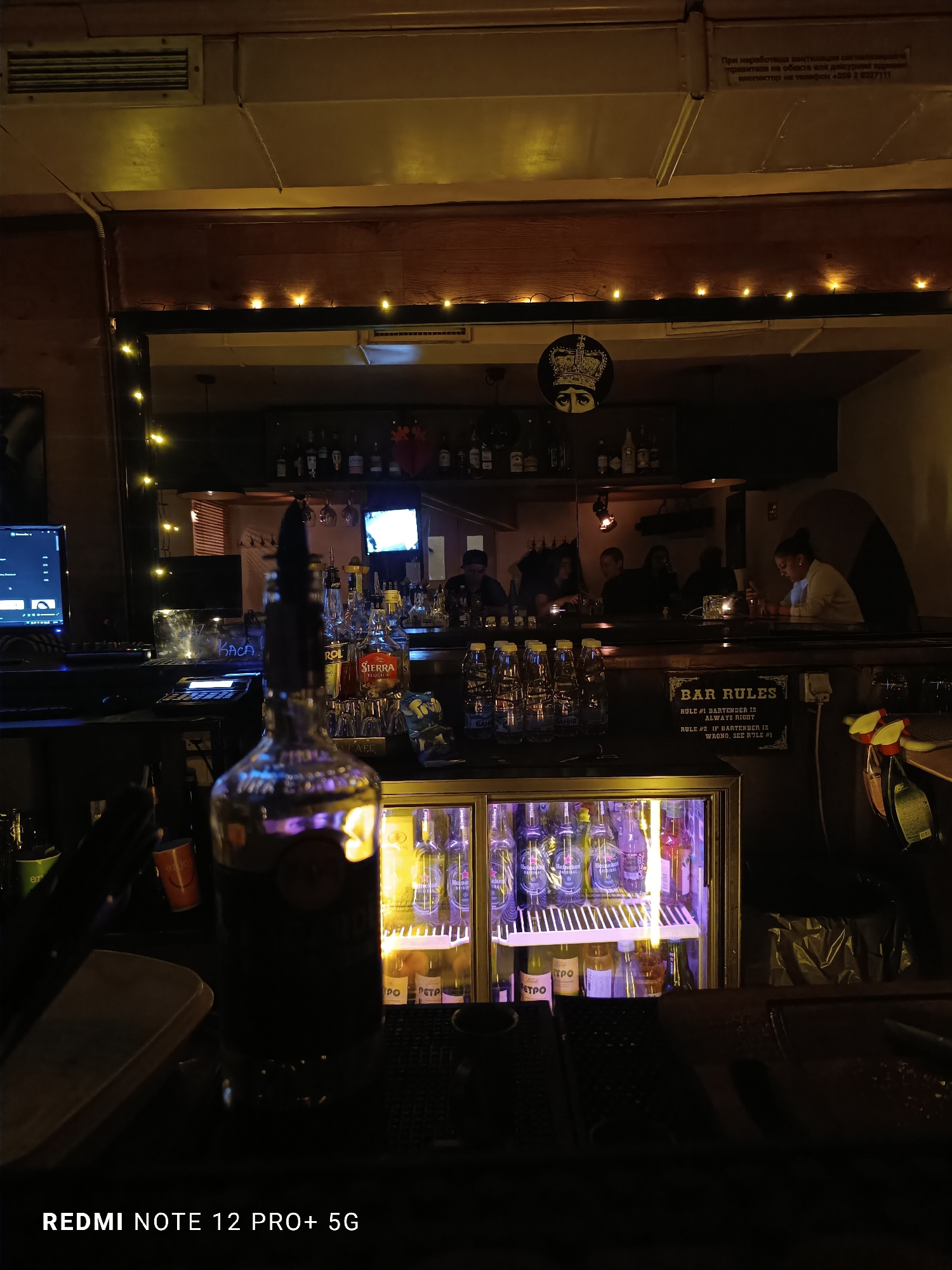 The image captures the dimly lit interior of a bar in Sofia, Bulgaria. A blurry liquor bottle dominates the foreground. Behind it, a counter displays various alcohol brands, with Sierra Tequila visible. A refrigerated display case showcases rows of Heineken beer and other drinks, including ones labeled "Петро." Above the counter, a mirror reflects the bar's patrons, who are seated at tables in the background. A TV screen and various bottles line the shelves behind the bar. Above the mirror, a string of lights provides additional illumination. A sign reading "BAR RULES" is visible, stating "RULE #1 BARTENDER IS ALWAYS RIGHT" and "RULE #2 IF BARTENDER IS WRONG, SEE RULE #1." Text in Bulgarian is also present, mentioning ventilation problems and contact information. The camera used to capture the image is identified as a "REDMI NOTE 12 PRO+ 5G."