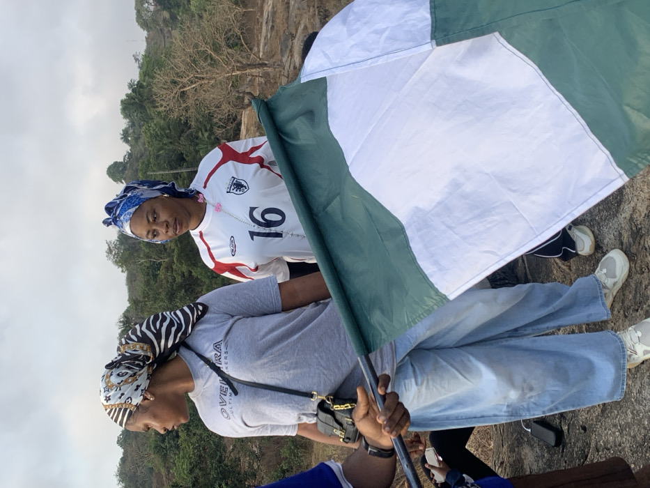 Two women stand outdoors, one wearing a white sports jersey with the number 16. Both have headscarves. A green and white flag obscures a portion of the scene. One woman is wearing a gray shirt with a shoulder bag and light blue jeans. A third person, partially visible, is wearing a blue garment. The background features trees and a gray sky. Feet in sneakers are visible, indicating at least one more individual present.