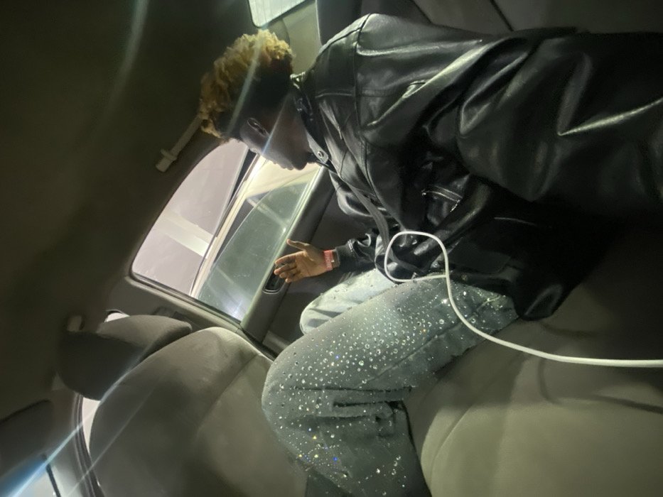 The scene is located within a vehicle's backseat, in Ikate, Nigeria. A dark-skinned male with short, curly, blonde-tipped hair is seated on the right rear passenger side, gazing out the vehicle's window. He wears a black leather jacket. His left hand, adorned with a red wristband, rests on the door panel near the window. His legs are extended across the seat, clad in dark-wash denim jeans heavily embellished with reflective studs. A white charging cable extends from his lap towards a black bag positioned beside him. The vehicle's interior consists of grey upholstery and headrests. Visible through the window is an exterior environment, appearing to be an artificially lit parking area, with reflections from other vehicles present.