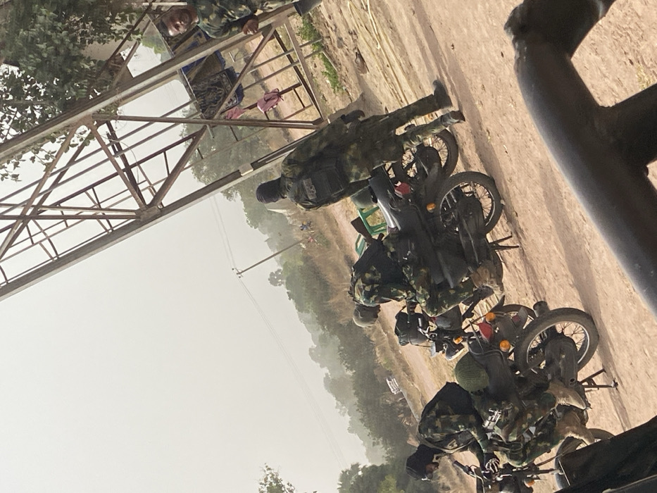 The scene is set in Zaki Biyem, Nigeria, depicting an outdoor, unpaved area under a hazy, light-colored sky. Four individuals are present, all wearing camouflage military-style uniforms. In the foreground, three dark-colored motorcycles are parked on reddish-brown, dusty ground. The motorcycle on the far left has an individual seated on it, wearing a black balaclava and a tactical vest over their uniform. Adjacent to this, a second individual is hunched over another motorcycle, which features a green helmet on its seat and what appears to be a rifle or long gun strapped horizontally to its side. This person also wears a camouflage uniform and a tactical vest. A third individual stands upright to the right of the motorcycles, facing away from the camera, wearing a black balaclava, camouflage uniform, and a backpack or tactical vest with discernible white lettering, possibly "LOG". On the far right, a fourth individual is partially visible, facing slightly towards the camera with a subtle expression, also in a camouflage uniform. Behind the standing individual, a large, rusty metal lattice structure, possibly a communication or transmission tower, extends upwards. Below this structure, various pieces of fabric or tarpaulin are visible, suggesting rudimentary shelters, with items resembling clothing hanging from them. In the mid-ground, power lines stretch across the frame, positioned above sparse trees and vegetation, indicating a rural or semi-urban environment. The ground throughout is dry and unpaved.
