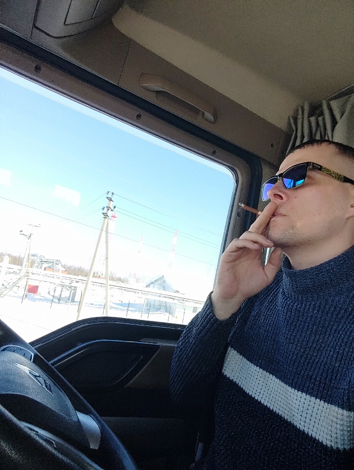 The image depicts a male individual inside a vehicle cabin, likely a truck, with an industrial landscape of Svetlyi, Russia, visible through the window
