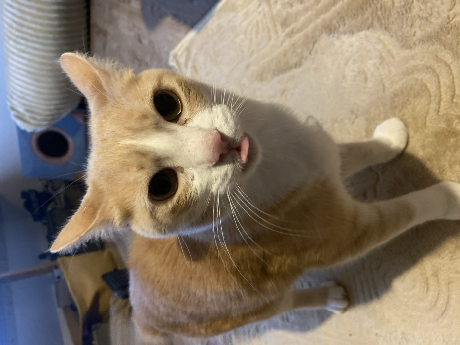 - "An orange and white cat looks up at the camera with its tongue slightly sticking out" by FM-xTDQG2, licensed under CC BY 4.0
