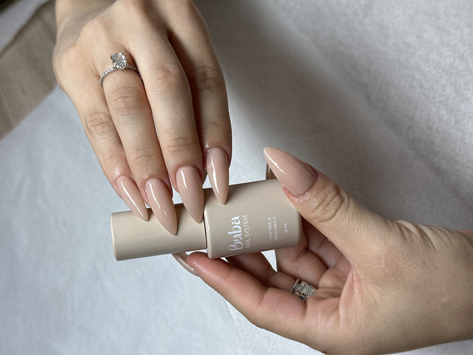 In Kafr Kasim, Israel, a close-up image captures two human hands on a light, textured surface. The hand on the lower left holds a cylindrical, light beige "Buba NAIL SYSTEM" bottle, labeled "TPD FREE X HEMA FREE X 16 ML." This hand wears a silver-toned, textured ring on its ring finger, and its fingernails are short. Positioned above and to the right, the second hand displays five long, pointed, almond-shaped nails, each uniformly coated with a glossy, light nude or beige polish. This hand features a silver-toned ring with an oval-cut clear gemstone, flanked by smaller stones, on its ring finger. The interaction suggests the product in the bottle is related to the nail application on the upper hand.
