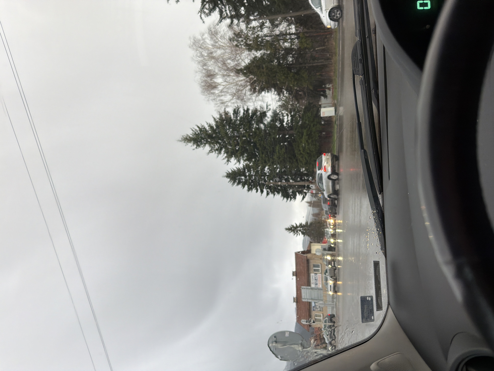 The photo is taken from inside a car, looking out onto a street in Dragichevo, Bulgaria. It's a cloudy, possibly rainy day, as evidenced by the water droplets on the windshield and the wet road surface. The street is lined with buildings, including a building with a red tile roof and windows covered with ads. There are multiple cars parked on both sides of the street, and some cars are driving ahead. Trees are visible in the background along the road. Power lines stretch across the sky. The interior of the car is visible, including part of the steering wheel, windshield wipers, and dashboard with a lit indicator.