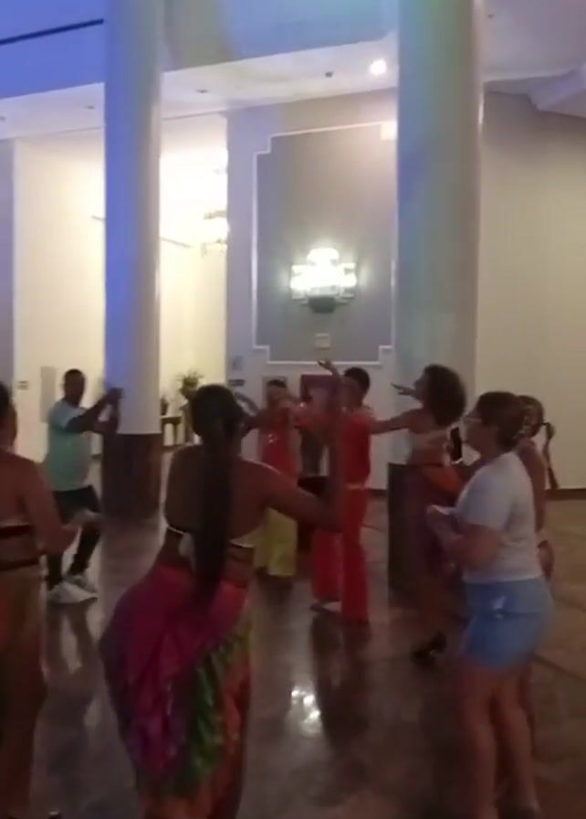 A group of people, including male and female dancers in colorful outfits, are performing a dance in a spacious hall. The women wear skirts with vibrant colors like red, green, and orange, and the men are in red or green outfits. The hall has a marble floor, white walls, and tall white pillars. The lighting changes from blue to pink, creating a festive atmosphere. Some people in the background are clapping and watching the performance.