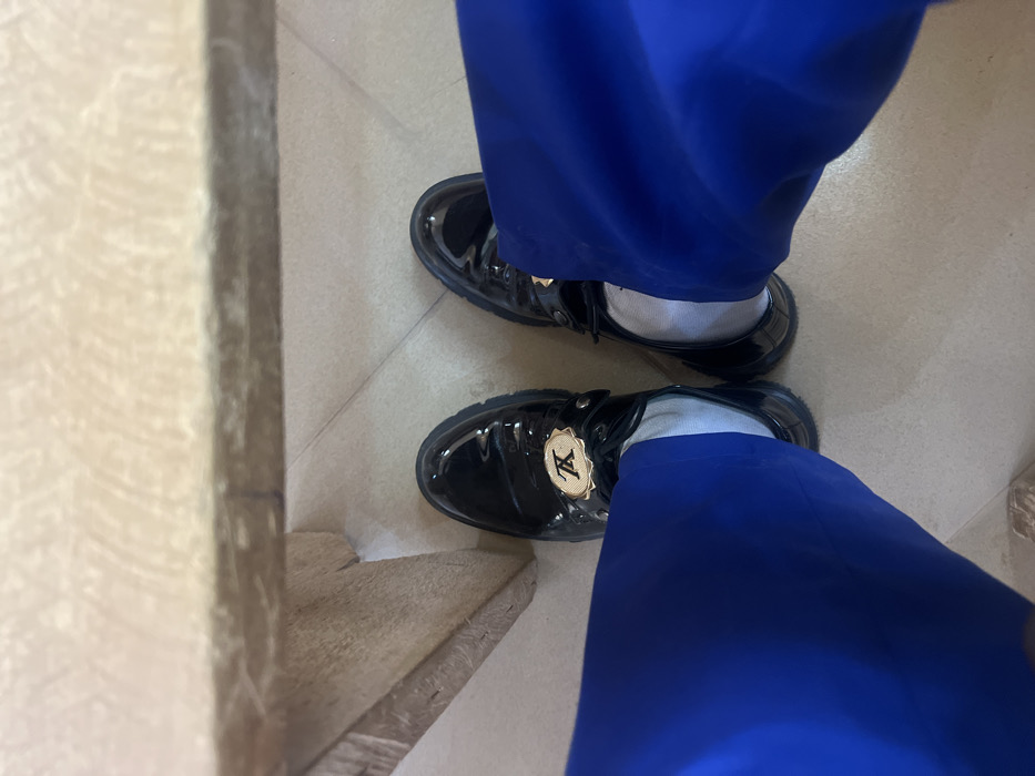 An overhead perspective captures the feet of an individual wearing royal blue trousers and white socks. The individual is wearing a pair of black, glossy, patent leather-like shoes with thick black soles. Each shoe features a prominent gold-colored, oval-shaped emblem displaying a stylized "LV" monogram on the vamp. The feet are positioned on a light-colored tiled floor with visible grout lines. A wooden structure, consistent with a table leg or furniture base, is partially visible in the upper left and central-left of the frame. The scene takes place indoors in Birnin Kebbi, Nigeria; the specific building or address is not discernible from the visual evidence.