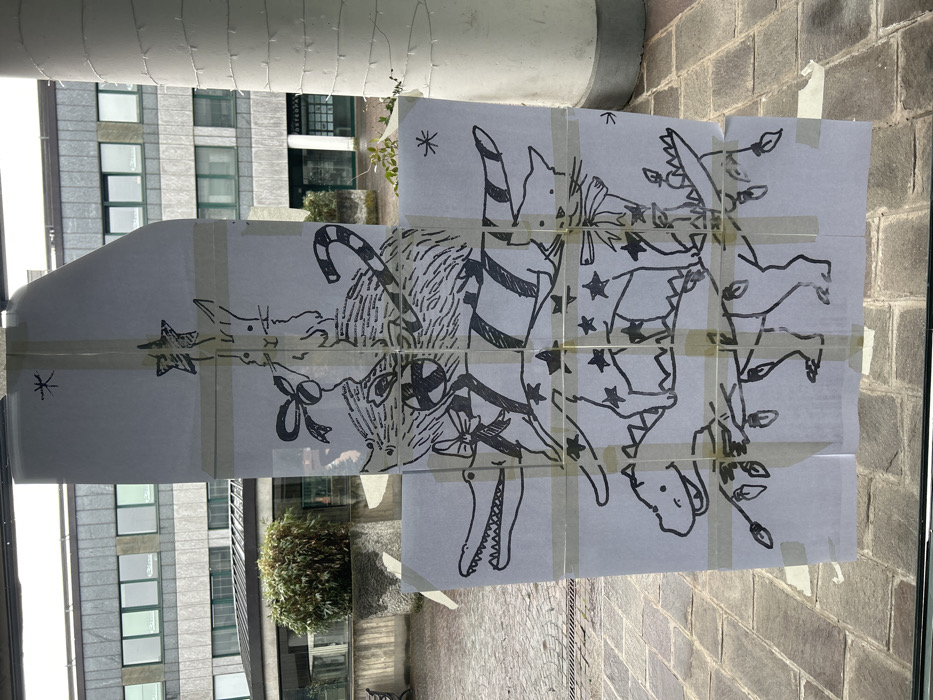 A multi-panel drawing, assembled from numerous white paper sheets taped together, is affixed to a transparent glass surface