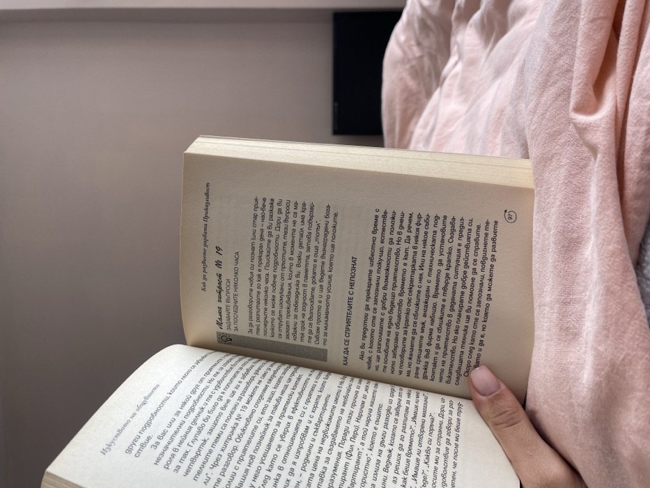 The image depicts an indoor scene in Blagoevgrad, Bulgaria, focusing on a left human hand holding an open paperback book