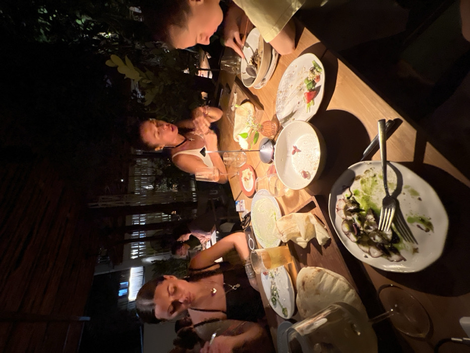 The image presents a nighttime dining scene at a semi-outdoor restaurant in Uluwatu, Indonesia. Three individuals are seated at a light-colored wooden table, illuminated primarily by a central, upward-facing portable table lamp and ambient light. On the left, a woman with dark hair styled in braids, wearing a dark (likely black) sleeveless top and a heart-shaped pendant necklace, is visible looking down. In the center, a woman with dark hair, a white sleeveless top, and a dark choker necklace with a cross pendant, is observed looking forward or down, with her hands clasped or resting on the table. A third individual, partially visible on the far right, has lighter hair and is wearing a light-colored (possibly yellow) top, leaning over a plate. The table is extensively covered with plates, predominantly showing remnants of food, indicating a meal in progress or recently concluded. Notable items include a white oval plate with portions of octopus or calamari in a green sauce, accompanied by a fork; several other white plates with food scraps (e.g., salad, bread crumbs); and a deeper, mostly empty bowl with small red fragments. Beverages present include a stemmed glass with a light-colored liquid (possibly white wine) on the far left, a beer glass with a golden liquid, and a clear glass with water. A wooden board holds pieces of flatbread. A small clear vase containing sprigs of greenery or small flowers, and a small stack of cigarette packs or a similar box, are also visible. The environment features a visible thatched roof structure overhead. The background is dimly lit but reveals a building with vertical slatted panels and some illuminated interior sections, along with dark, dense tropical foliage, consistent with an open-air or garden restaurant setting. Additional blurred figures are discernible in the background, suggesting other patrons.