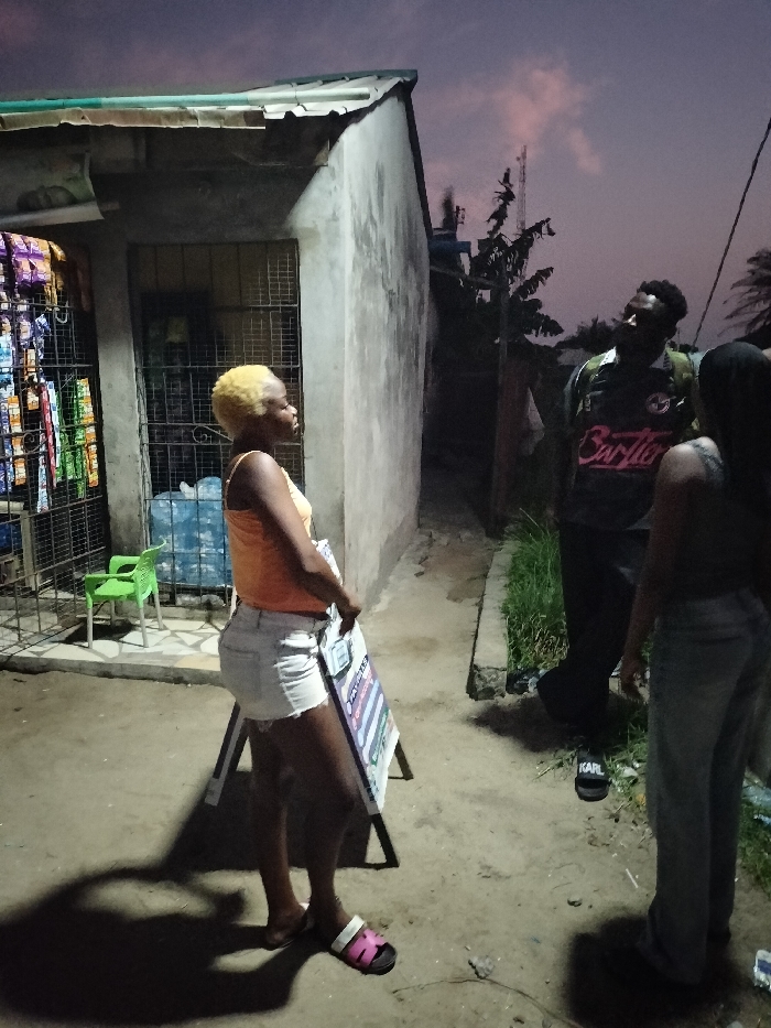Three people stand outside a small building at dusk. The person on the left with blonde hair wears shorts and an orange top, holding a sign. A man stands facing them wearing a dark shirt with a pink graphic. To the right of the man is a woman facing away from the camera wearing jeans and a tank top. A green chair is visible near a building with assorted goods displayed. A pair of black slides with the brand name "KARL" are on the ground.