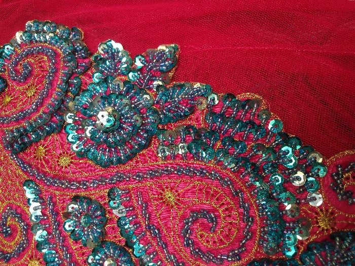The image displays a detailed, close-up view of an intricately embroidered textile. The base fabric is a deep pink, woven material, adorned with patterns created using fuchsia-colored seed beads, metallic gold thread, and iridescent teal sequins. The design features stylized floral motifs, typically formed by concentric circles of teal sequins and seed beads, interspersed with curvilinear and swirling patterns outlined in gold thread and dark pink seed beads. Additional teal seed beads are integrated throughout the embroidery. On the right side of the frame, a section of sheer, fine-mesh netting in the same deep pink hue is visible, layered over or adjacent to the embroidered fabric. The textile is located in Pokhara, Nepal. No individuals, actions, interactions, or further specific environmental details are discernible within the frame.