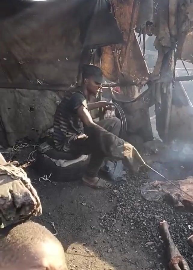 A man in dirty clothes and a cap is sitting on a tire, tending a fire, using a long metal rod to move objects around in the flames. The fire is situated in a makeshift shelter constructed from scraps. Several animal hooves are lying on the ground near the fire. A child's face is visible in the foreground, looking up and to the left. Smoke is rising from the fire. The environment appears to be dirty and makeshift.