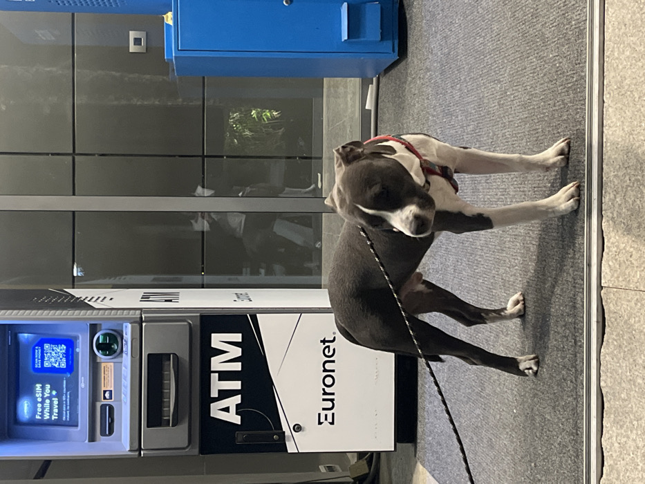 The scene is set in Budva, Montenegro, depicting a grey and white American Staffordshire Terrier or Pit Bull type dog standing on a dark grey carpeted surface. The dog, wearing a red harness and a dark, speckled leash, faces slightly to its right with its head lowered. To the left of the dog is a silver-grey Euronet ATM. Its screen displays a blue interface with the text "Free eSIM While You Travel +" and a QR code. Below the screen, the ATM has a card slot, keypad, and cash dispenser, with "ATM Euronet" printed on its lower front panel. Behind the ATM and the dog, a dark paneled glass facade reflects the lower torso and legs of a person, possibly the dog's owner, and some interior greenery. To the far right of the frame, a bright blue metallic cabinet or machine is partially visible. The foreground shows a transition from the dark grey carpet to a lighter tiled floor, separated by a metallic strip.