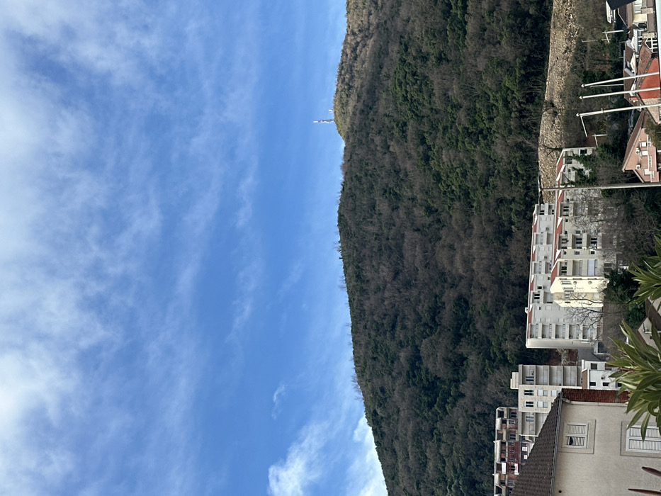 lush, densely forested hillside juxtaposed with a clear blue sky scattered with wispy clouds. Buildings line the base of the hill, contrasting the natural environment with human development. A structure can be seen at the top of the hill.