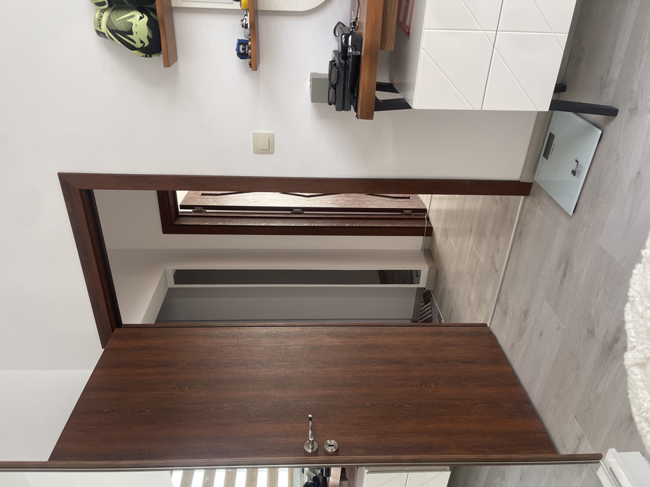 The image presents an interior residential scene within a dwelling located in Varna, Bulgaria. The primary subject is a partially open, dark brown wooden door with a silver handle, positioned on the left side of the frame. This door features a reflective surface, mirroring horizontal window blinds. The immediate floor consists of light-colored laminate, with a segment of a white, textured rug visible in the lower-left corner. Centrally, a doorway with dark brown wooden trim leads into a distinct hallway. The hallway floor is laid with light grey tiles. Visible within the hallway is a second, partially ajar dark brown wooden door, distinguished by a curved, wavy panel design. Reflections from another mirror or glossy surface are perceptible along the hallway wall. On the right side of the main doorway, a white digital weighing scale rests on the laminate floor. Above it, on a white wall, a light-colored electrical switch is mounted. Two wooden wall shelves are affixed to the white wall further to the right. The upper shelf holds a pair of green and black athletic shoes, while the lower shelf displays several small decorative items, including a miniature blue boxing glove. Below these shelves, a white piece of furniture, possibly a dresser or desk, with a textured, geometric front and dark metal legs, stands against the wall. Its wooden top supports a pair of dark sunglasses, a black pouch, and other miscellaneous small objects. No individuals are present in the scene.