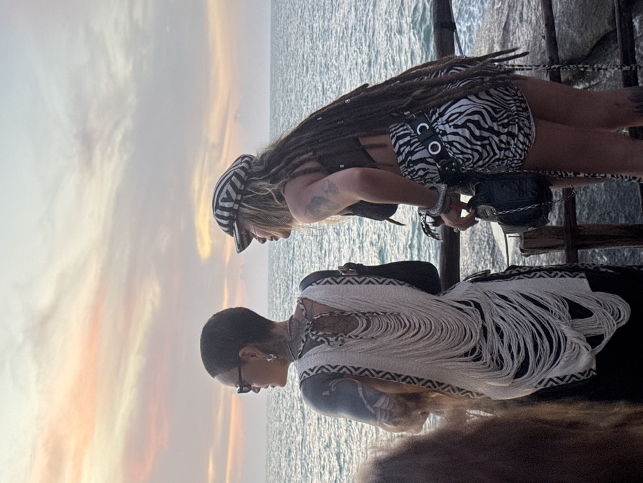 Two tattooed women stand near a body of water under a vibrant sky. One woman has short, dark hair, glasses, and a fringed shawl with a geometric pattern. The other has long dreadlocks, a striped cap, and a zebra-print bottom. They appear to be on a wooden structure, possibly a dock or platform. The background shows a seascape with a colorful sky transitioning from orange to light blue.