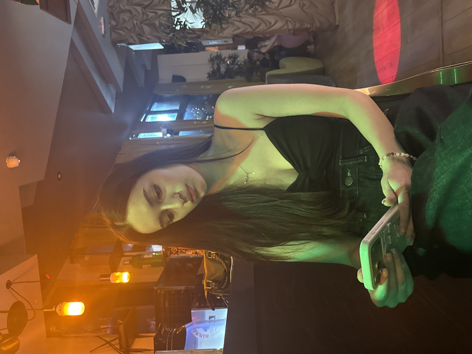 A young adult female is seated in what appears to be a dimly lit bar or lounge setting in Sofia, Bulgaria