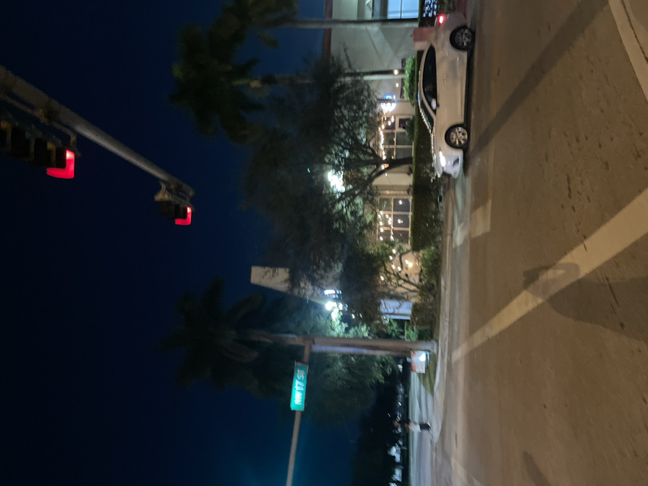 A nighttime scene depicts a white car parked on a street next to a building with lit windows. Palm trees are visible on both sides of the street. A traffic light structure is present with red lights illuminated. A green street sign reading "NW 17 St" is also visible on a pole. The street surface has white lines painted on it.