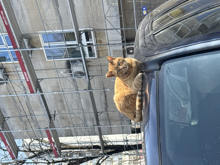 - "An orange tabby cat is observed resting prone on the dark-colored roof of a vehicle, possibly an SUV, facing forward directly towards the viewer" by FM-xxCob2, licensed under CC BY 4.0