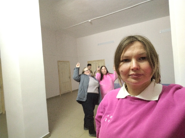 The image displays four individuals within an indoor setting in the city of Дойная, Russia. An adult female, with light brown hair and wearing a pink long-sleeved top with a white collar, occupies the foreground, facing the camera directly in a selfie. Behind her, to the left, an adult female in a dark grey jacket and black pants holds her right hand in a 'V' gesture. Further back and to the right, another adult female in a pink top is visible, with her hands raised near her head. Partially obscured behind her is an adult male with dark hair. The environment features light-colored walls, a light-toned floor, and two light brown wooden doors in the background. Overhead fluorescent lights illuminate the space.
