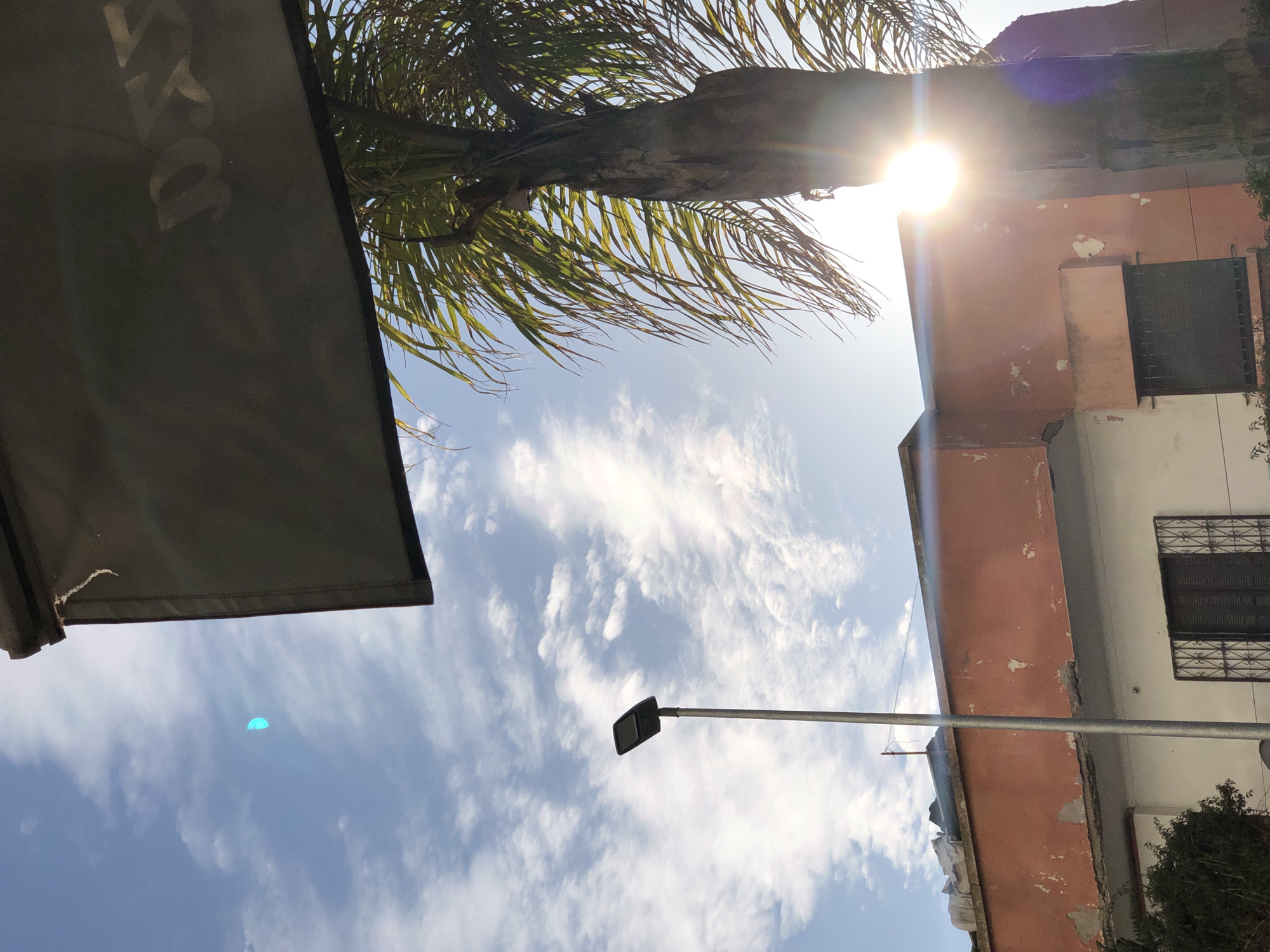 This image captures a bright, daytime urban scene in Casablanca, Morocco, under a blue sky scattered with white cumulus clouds. A dark, possibly grey, fabric awning extends into the frame from the top right, partially obscuring the sky. Faint, mirrored lettering, appearing to be "DXX", is discernible on the underside of the awning. A large palm tree, with its green and brown fronds, occupies the right side of the image, partially silhouetted against a strong sun flare emanating from behind its trunk. A tall, slender grey metallic street light pole, topped with a black, rectangular luminaire, stands in the mid-left, extending from the bottom of the frame towards the sky. In the lower-mid section, a building facade is visible, featuring an upper section painted a faded, peeling reddish-orange, revealing lighter underpaint. Below this, a white wall section with a dark, closed window shutter and an ornate metal security grill is present. A green bush occupies the lower-left foreground. No individuals, animals, or vehicles are depicted.