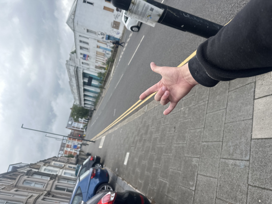 An overcast street scene features a row of parked cars along a sidewalk constructed of grey bricks. Parallel yellow lines mark the road, which leads toward a large, light-colored building with prominent columns. A person's hand, clad in a dark sweatshirt, extends into the frame, fingers bent into a gesture. The image is tilted, creating a slightly skewed perspective. A black pole stands at the edge of the sidewalk.