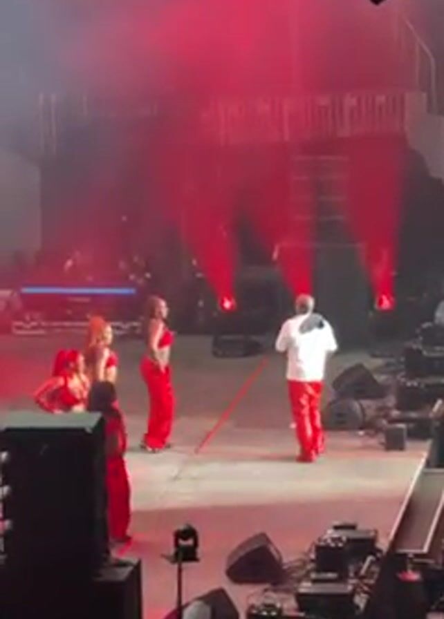 - ". The video captures a live stage performance featuring a male artist and several female dancers. The artist, wearing red pants and a white shirt, is positioned towards the back of the stage, facing away from the camera. He appears to be rapping or singing into a microphone. In the foreground, four female dancers are positioned facing the camera, dressed in matching red outfits. The stage is lit with red spotlights, with smoke or haze adding to the atmospheric effect. The backdrop includes a tiered structure and sound equipment. A small audience is visible in the background." by FM-AodXs2, licensed under CC BY 4.0