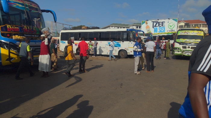 A bustling street scene features multiple vehicles, including large passenger buses painted in bright colors and white. Several people are scattered around the vehicles, some walking, others standing, and a few interacting with the buses. A large billboard with the words "TZEE NI SISTI" is visible in the background. The scene suggests a busy transportation hub or market area with a mix of activity and people moving about.