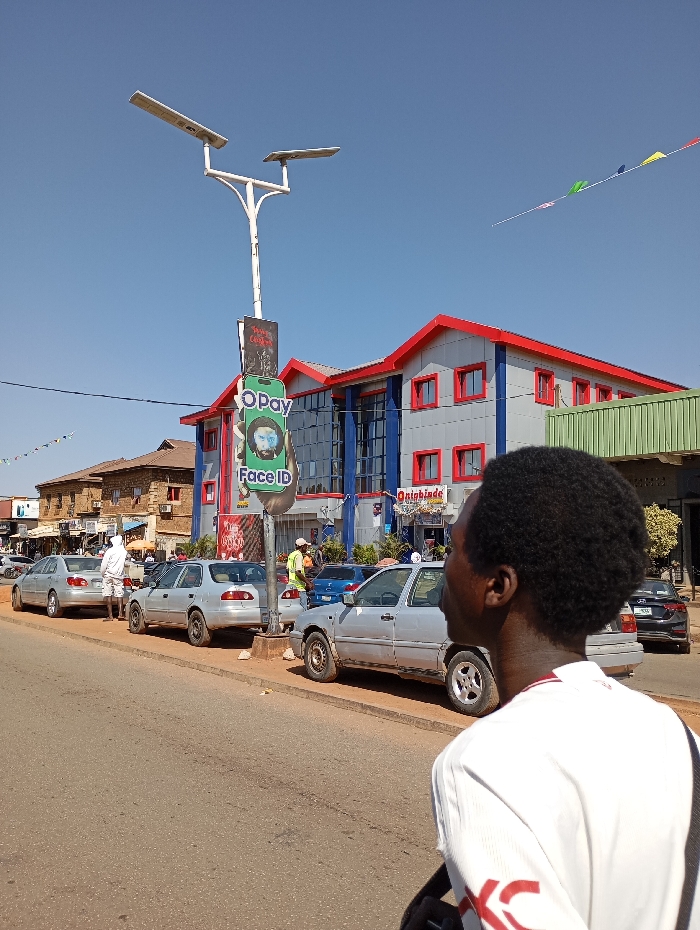 This image depicts a sunlit commercial street scene on Ahmadu Bello Way, Jos, Plateau State, Nigeria, specifically in the vicinity of the Ojaishinde building. In the foreground, from a slightly elevated perspective, the back and right profile of a male individual are visible. He has dark, curly hair and wears a white short-sleeved shirt with red detailing on the lower right side, looking towards the left side of the street. The midground features a paved road running left-to-right, with a dirt shoulder separating it from the buildings. Multiple vehicles are parked along the left side of the road, facing left: a silver sedan, followed by another silver sedan, and then an older silver two-door hatchback (Volkswagen Golf MK3 type). Behind these are a blue sedan and a dark-colored sedan, partially obscured. A man in a white hooded outfit and shorts stands on the pavement next to the second silver sedan. Further down the street, near the blue sedan, a person in a yellow safety vest and white cap stands near a pole. A prominent white metal street light pole stands centrally, featuring two solar-powered LED lights extending horizontally in a 'Y' shape. Attached to this pole is a vertical sign advertising "Opay" with a facial image and "Face ID" text. In the background, the most prominent structure is a modern, two-story commercial building with a red pitched roof, red window frames, and light gray and dark blue glass paneled facades. A sign on its front reads "Ojaishinde." To the left of this building, a row of older, multi-story buildings with brown, textured walls and traditional roofing is visible, suggesting smaller shops or residences. To the right of the Ojaishinde building, a green-slatted structure is partially visible. Faintly visible colored pennants are strung across the clear blue sky in the upper right.