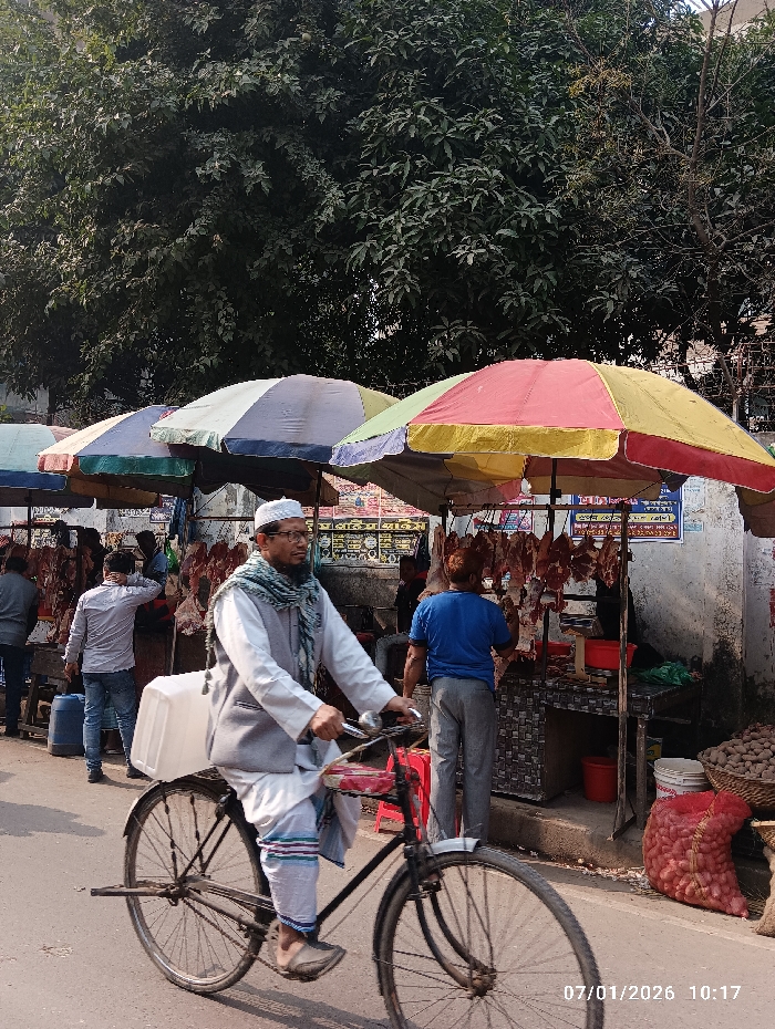 A man wearing a skullcap and a scarf rides a bicycle past a butcher shop in a bustling outdoor market. Fresh meat hangs under colorful umbrellas shading the vendors. The man wears a vest over a white garment and carries a white container attached to his bicycle. Other vendors and customers mingle in the background. Bags of onions and potatoes sit on the ground near the market stalls. The date "07/01/2026" is printed in the lower right corner.