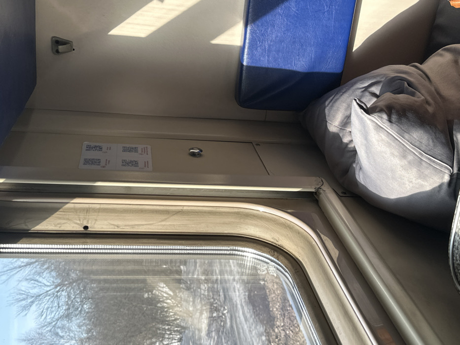 The scene depicts the interior of a train compartment. While the prompt references the city of Козьмодемьянск, Russia, the external view through the window shows a generic winter landscape with bare deciduous trees and snow-covered ground under a bright blue sky, indicating the train is moving through an undeveloped or rural area rather than a dense cityscape. The image is captured from a slightly elevated perspective, looking towards a large, rounded rectangular window on the left, which is framed by a light beige or off-white material showing signs of wear and dirt. Strong sunlight enters through this window, casting defined shadows on the interior surfaces. To the right of the window, on a vertical panel, four white square stickers with black QR codes are arranged in two vertical pairs. Below these stickers, a small, polished metal knob or latch is visible. Further to the right and lower, a section of a dark blue upholstered seat or backrest is partially visible, also illuminated by sunlight. In the lower right foreground, a large, plush gray pillow or cushion rests against the wall and the base of the window. No people are present in the frame. The external environment through the window appears somewhat blurred, consistent with movement.