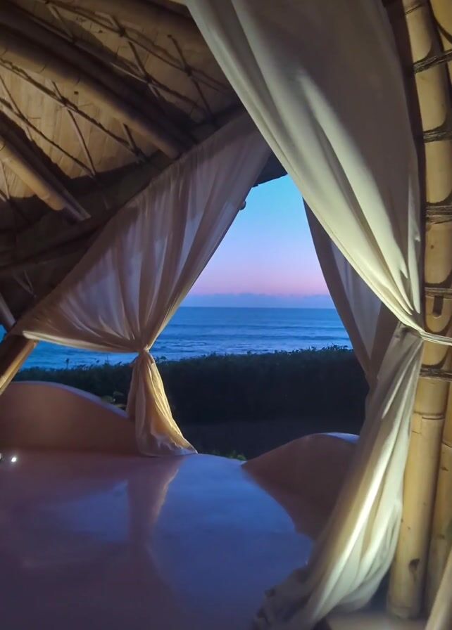The camera is inside a bamboo hut-like structure, with white curtains tied back to reveal a view of the ocean