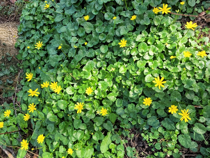 The location is in the city of Ifs, France. The scene depicts a dense natural ground cover. No people are present. The primary subjects are numerous green herbaceous plants with small, rounded leaves, forming a continuous carpet across the frame. Interspersed among the foliage are approximately 40-50 small, bright yellow flowers, each featuring multiple narrow petals. A section of a tree trunk with textured, light brown bark is partially visible in the upper right quadrant, surrounded by additional green vegetation and some dried organic debris. The ground on the left side shows darker soil and scattered dry plant matter. The lighting appears to be natural daylight, casting subtle shadows and highlights across the plant surface. No actions or interactions are depicted.